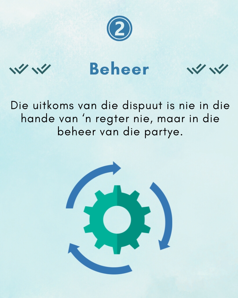 Mediasie verskil van arbitrasie en litigasie in dié opsig dat die mediator nie self die besluite neem of die uitkomste voorskryf nie. ‘n Mediator bemagtig die partye in dispuut om hulle eie oplossings op basis van konsensus te vind.